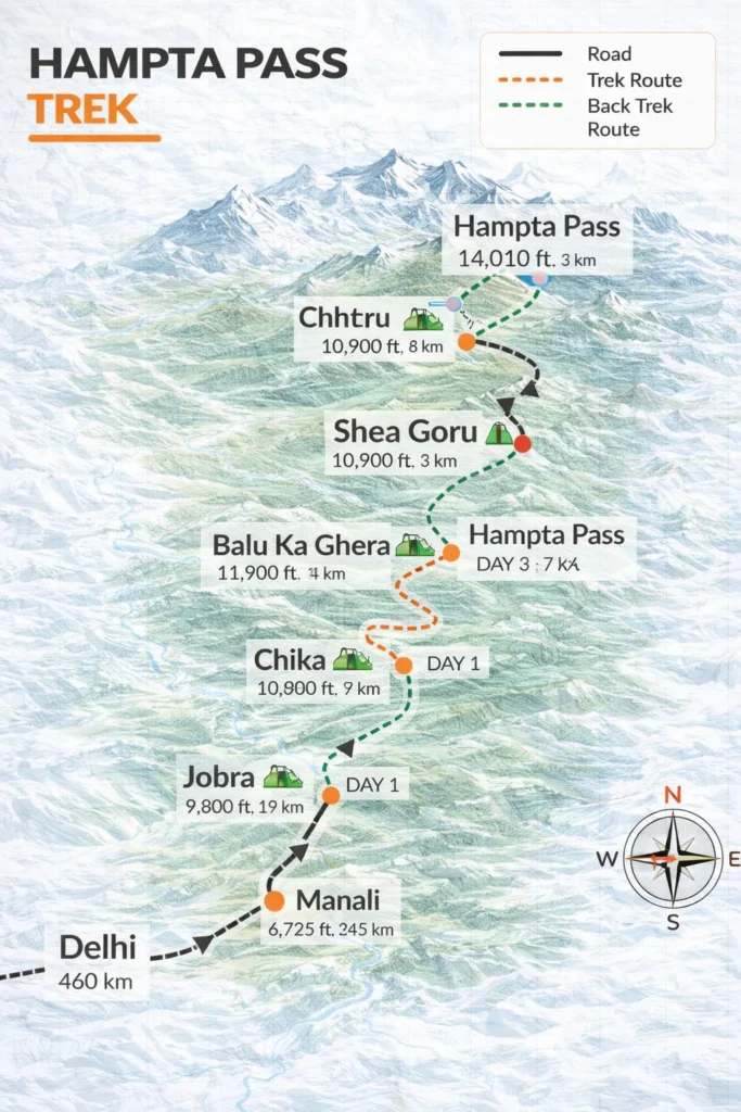 Hampta Pass Trek is one of the most dramatic crossover treks in Himachal Pradesh. It connects the lush green Kullu Valley with the stark, desert-like landscape of Lahaul. This sudden contrast in scenery makes Hampta Pass one of the most unique and visually rewarding treks in the Himalayas.