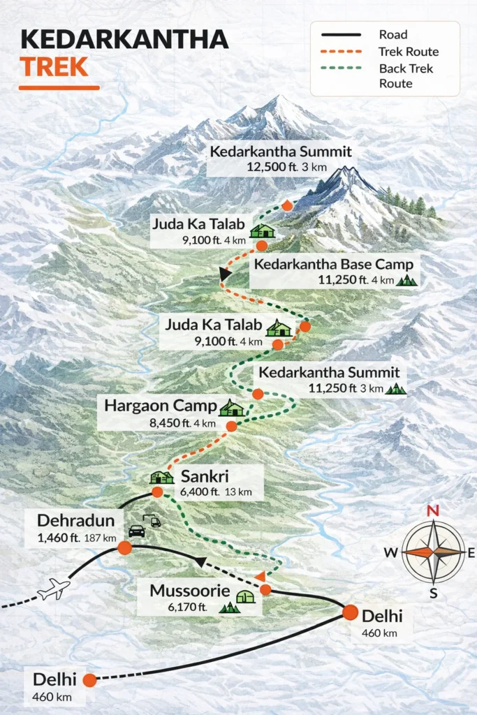 The trek usually begins from the small mountain village of Sankri, which serves as the base camp. From here, the trail gradually climbs through beautiful forests of oak, pine, and rhododendron. During winter, the entire route is blanketed in fresh snow, turning the landscape into a white wonderland. Along the way, trekkers pass through scenic campsites such as Juda Ka Talab, a frozen alpine lake surrounded by tall trees, and Kedarkantha Base Camp, which offers spectacular views of the surrounding peaks.